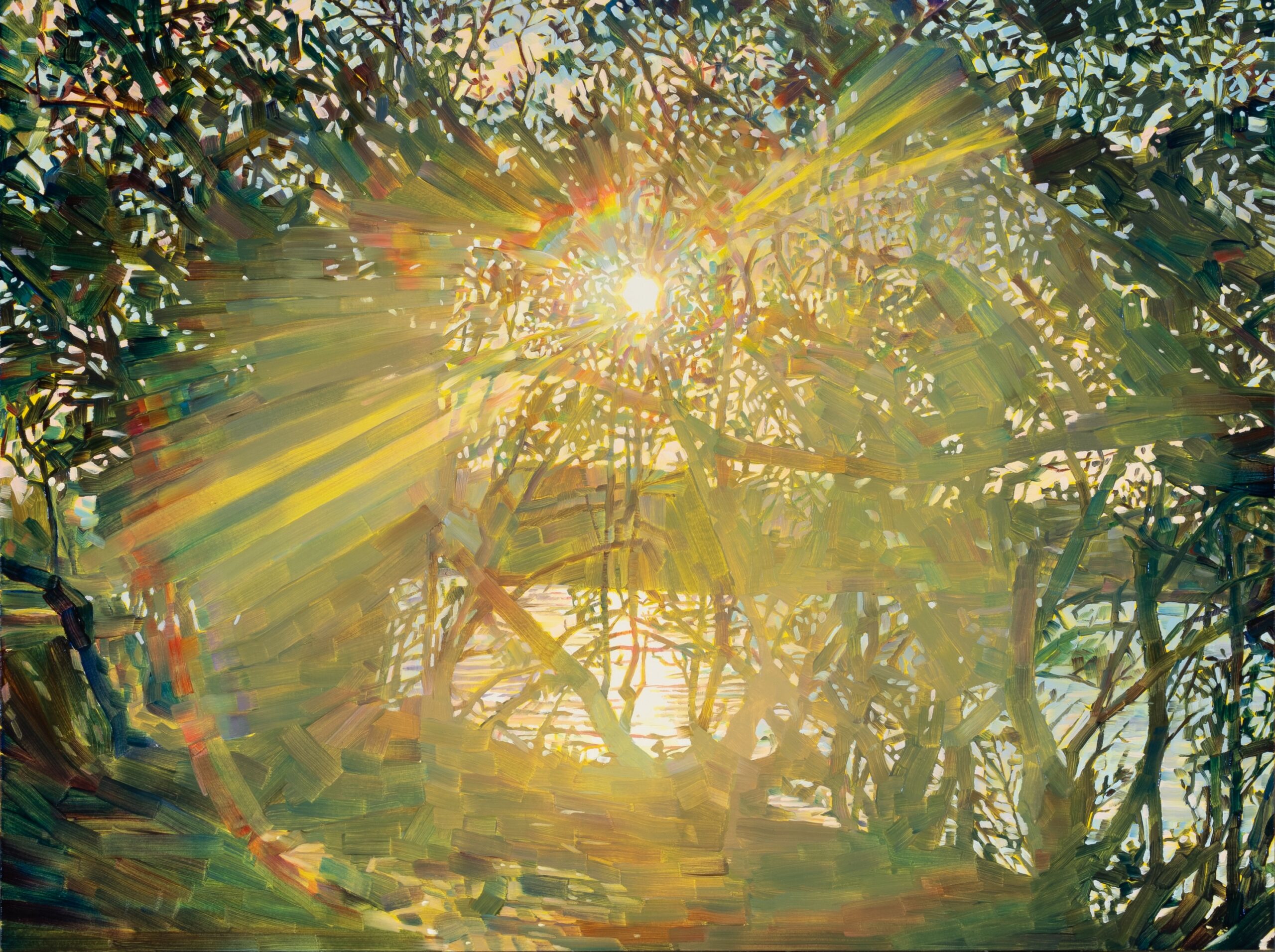 It’s sort of both. I always like to have an underlying geometric structure to the images I make, so I often notice things around me that have a very obvious geometric structure, like a stripy curtain or a swimming pool with gridded tiles. I can tell from looking at them what it would be like to build them in the studio with painted marks. In some other paintings though, like those of trees in a forest, the underlying structure is more hidden from everyday looking, more complicated, and by painting them I get to draw out that structure by building the surface of the image with individuated block-like marks, finding the structure as I go.