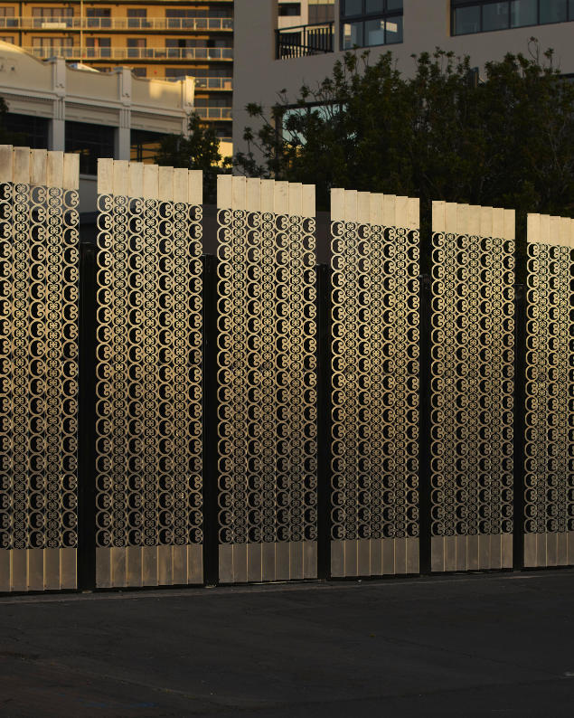 Moemoeā: A Model for Dreaming features kōwhawhai pattern and allows the viewer to consider the ancestral stories it holds as it casts moving shadows. Hutchinson’s panels recalls the corrugated-iron roofs of settler-style homes across Aotearoa New Zealand, while its pattern offers a counter rhythm.